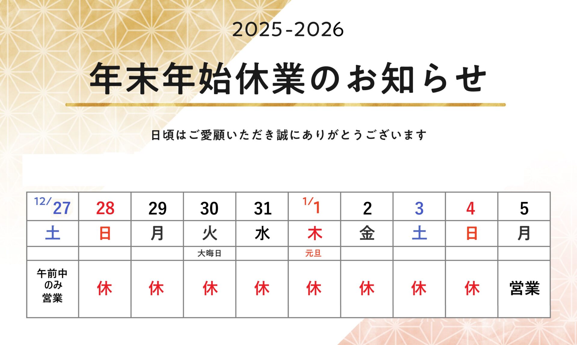 年末年始休業期間中は何かとご迷惑をおかけいたしますが、何卒ご了承のほど、お願い申し上げます。